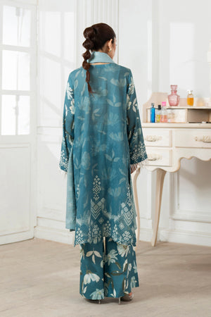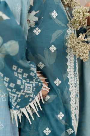 Crafted in a rich cadet blue tone, this premium embroidered jacquard lawn suit offers a modern, festive look. The printed embroidered shirt in self jacquard fabric is complemented by an embroidered tube slub dupatta and digital print cotton trouser, perfect for elegant summer occasions.